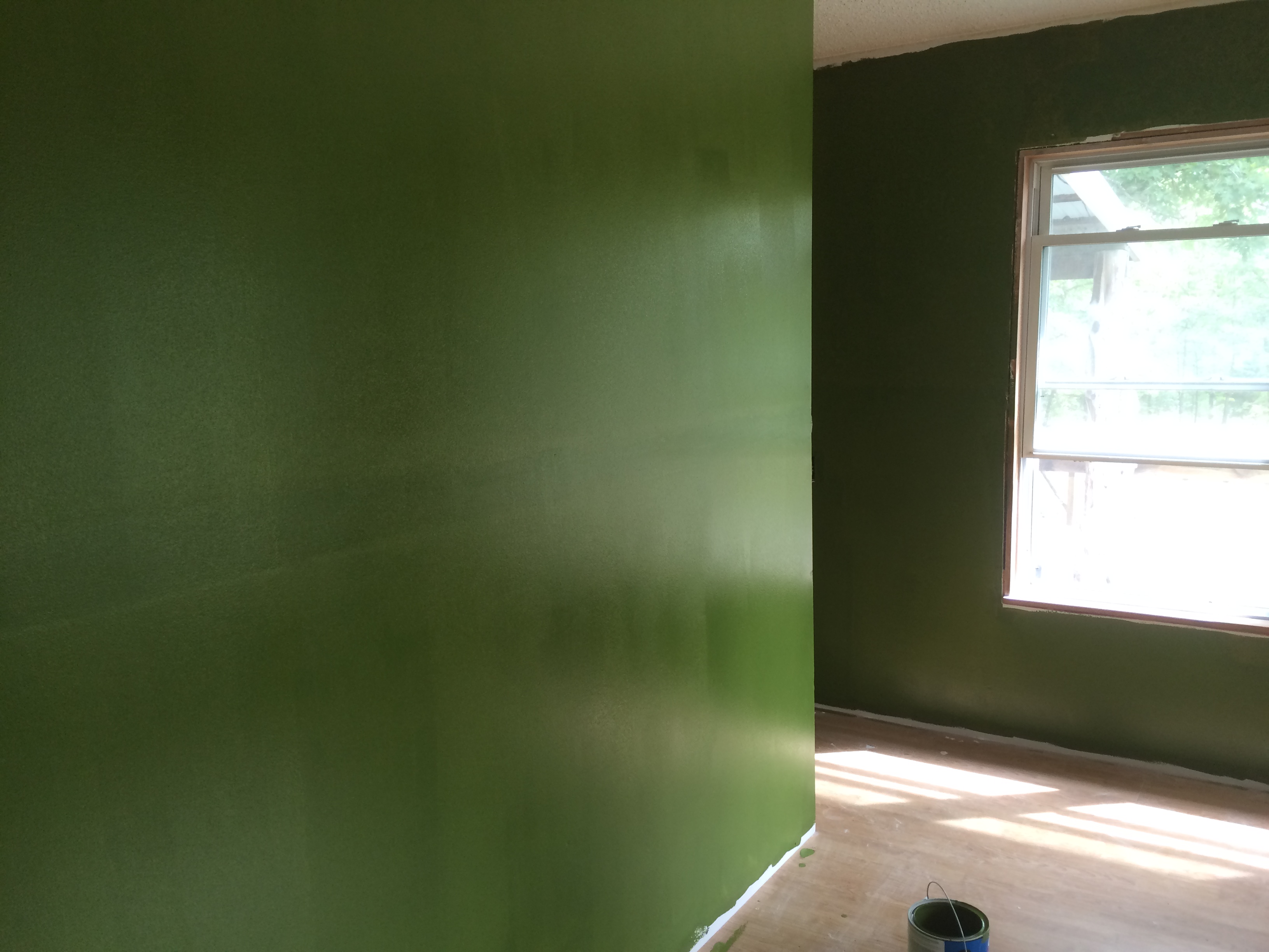 Next, since I couldn’t avoid it any longer, I pulled out the green paint and glopped it on the kitchen side of the bathroom door. Glop. Glop.