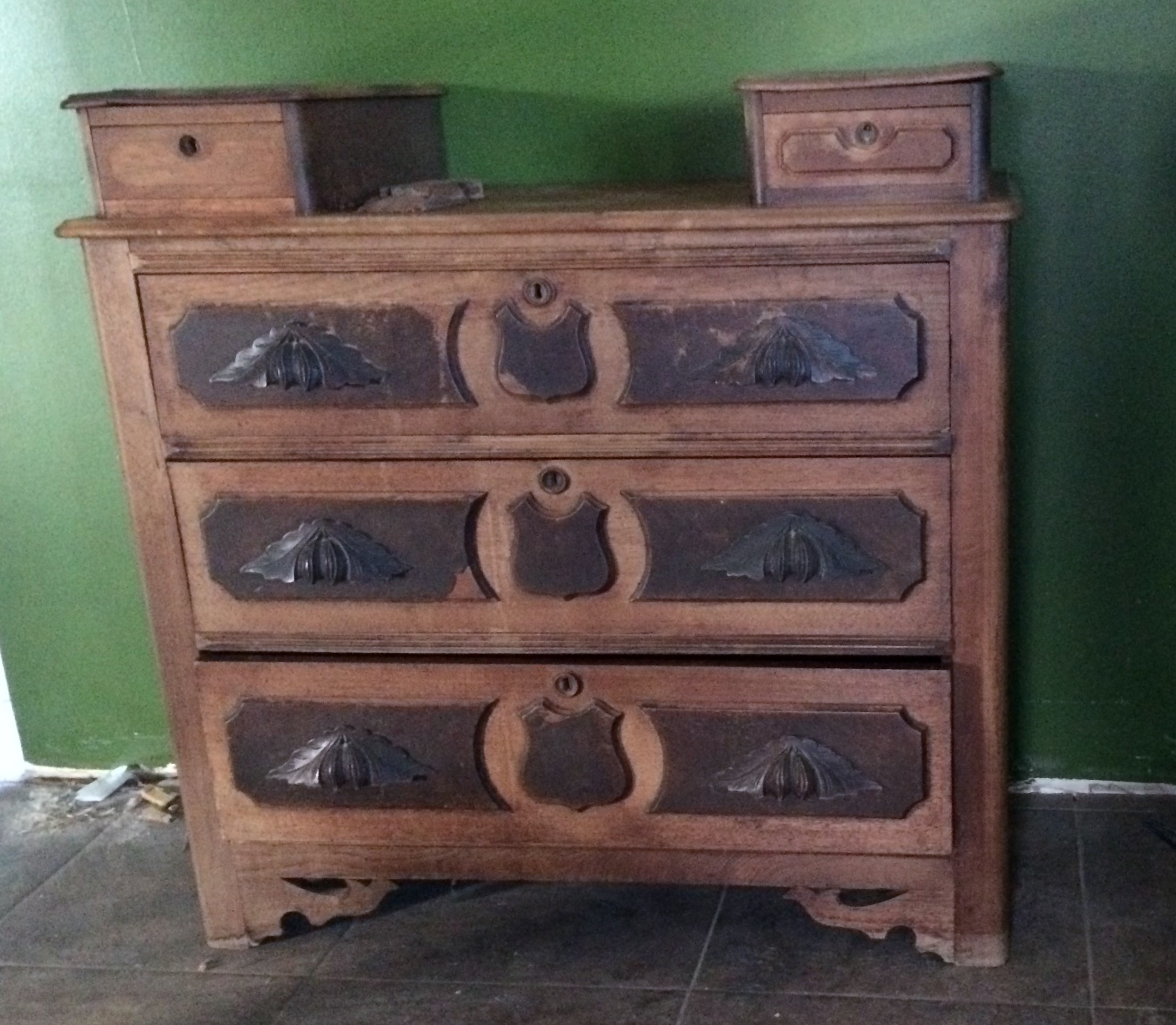 We also brought down the antique dresser, c. 1850, my favorite antique find from about 12 or so years ago; also the bookshelf for my cookbooks. It’s gonna be a challenge to fit them all on there.