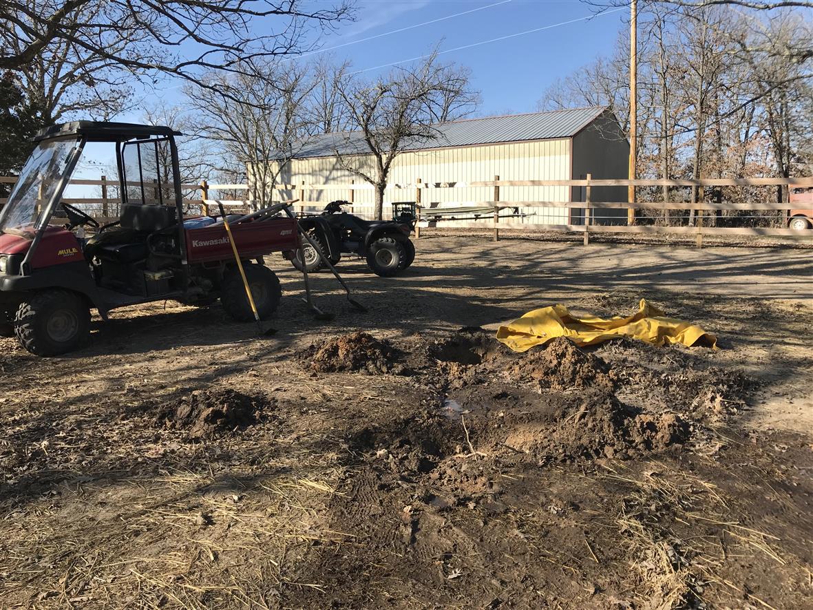 Today, for instance. I noticed a few days or so ago that there was a damp spot in the south paddock. Thought maybe it was just a pile of leaves, but we haven’t had any rain to speak of. Yesterday, I raked away the leaves and straw, and yep, a water leak. Pretty chilly yesterday, and it’s a project that takes a lot of time, so we planned it for today when it was supposed to be warmer.