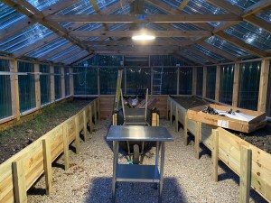 Now I’ve got grow lights, a rain barrel/pump watering system, elevated beds, and a work table. I’ll overwinter my outdoor container flowers, although some won’t make it, start next year’s baskets, and do a few experiments.