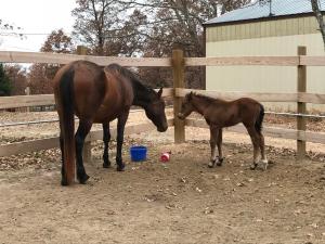 Trinket, who will be four weeks old tomorrow, has been having a blast chasing Aunt Nickel around the nursery and teasing her, and running on the edge of the big kids’ pseudo-stampedes while pretending to be a big horse. She has a larger bucket now, a red one, and is learning how to wear her first halter. She’s still a fan of butt scratches, but has tried to butt-bump me a couple times; she’s also learning the difference between horse and human.