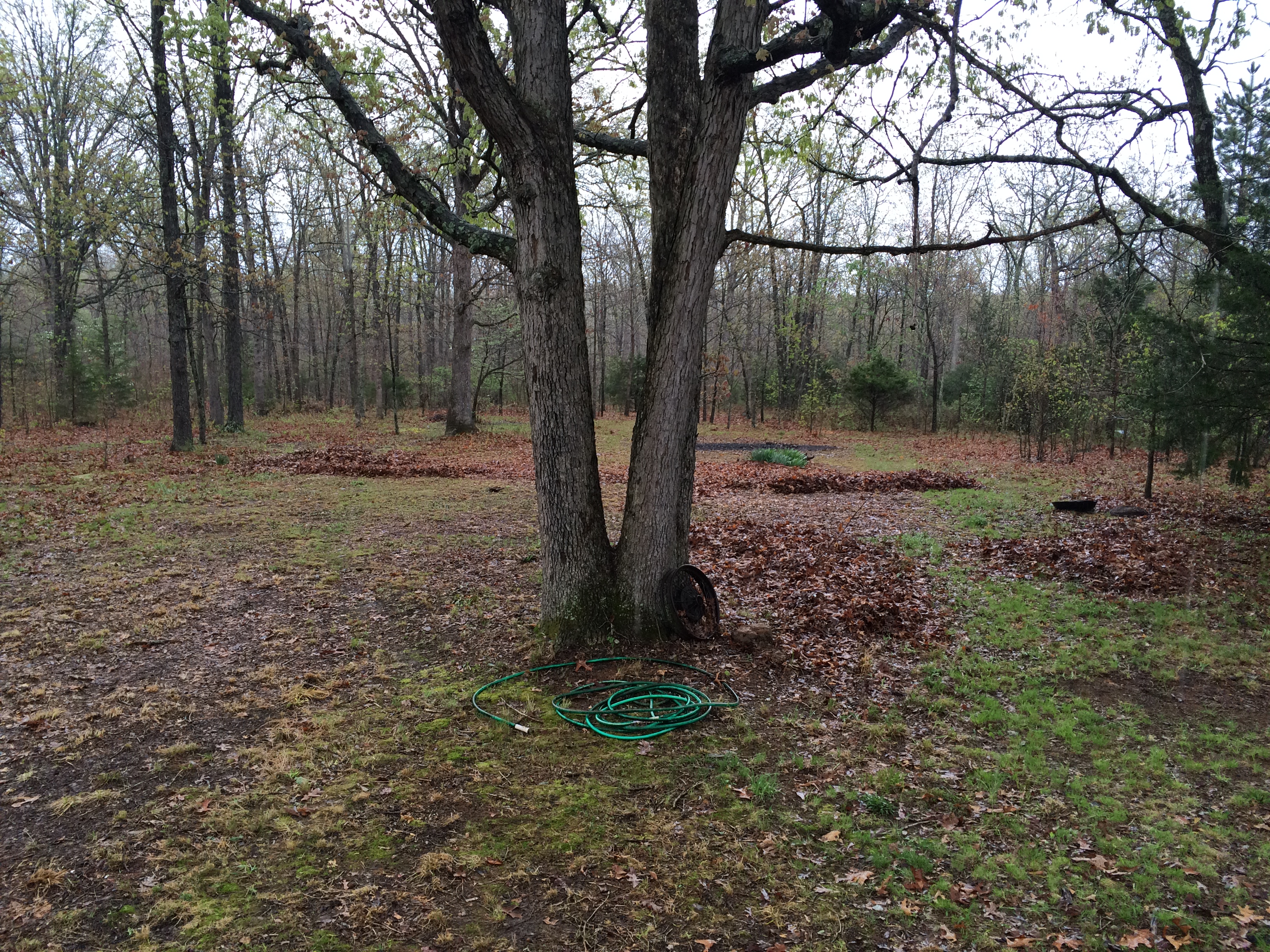 We’d planned to drill holes for the outhouse and kitchen shelter and set the posts, but alas. The auger we’d ordered didn’t arrive, in STL, until about 7:00 p.m. Friday, long after we’d headed out to the farm. Go figure. Thanks, UPS. 😦